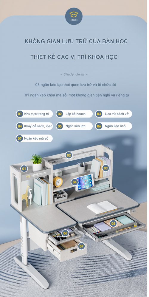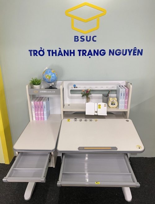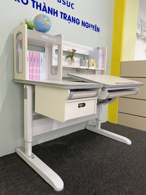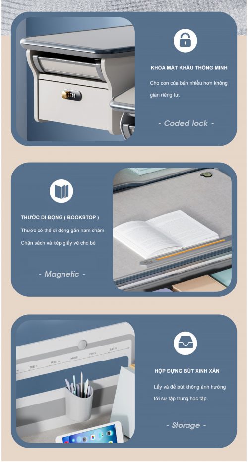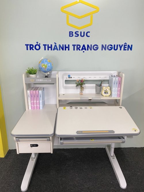 - Phụ kiện:Kệ sách, ngăn bàn, giá đặt sách/ipad, hộc đựng đồ, chặn sách, móc treo cặp, đồng hồ hiển thị độ nghiêng, ngăo kép khóa mật mã hiện đại, chân bàn có bánh xe di chuyển.