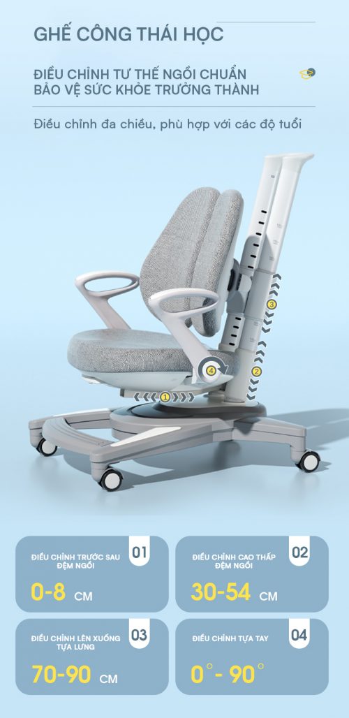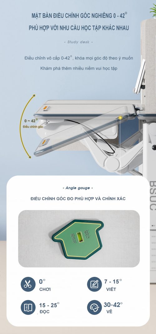 - Chế độ:Nâng hạ chiều cao bàn – ghế, điều chỉnh độ nghiêng mặt bàn.