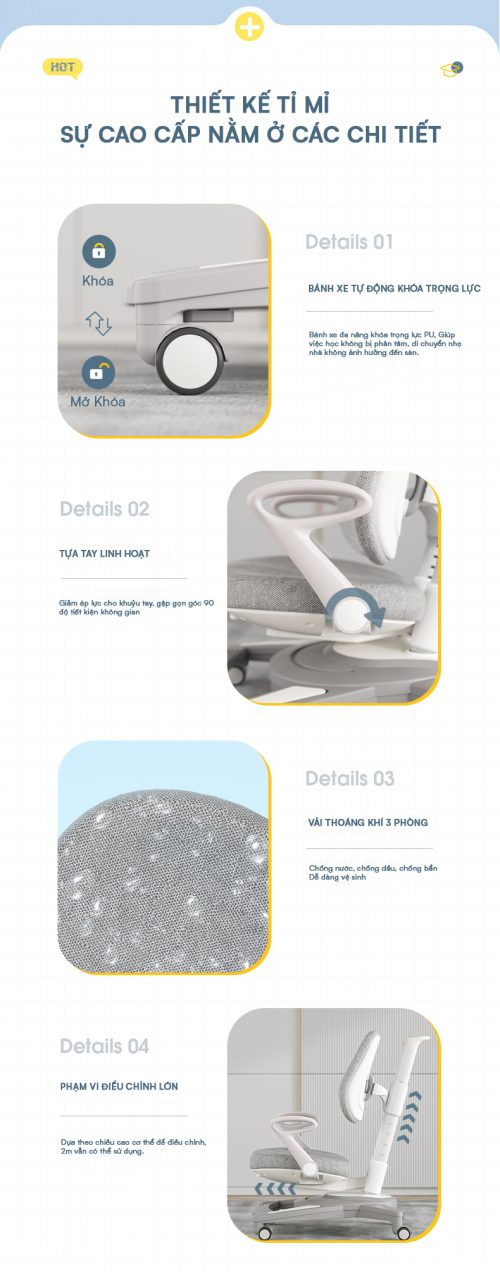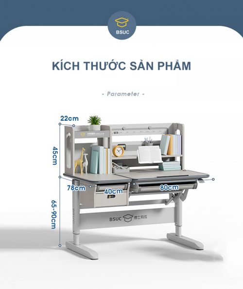 - Phụ kiện:Kệ sách, ngăn bàn, giá đặt sách/ipad, hộc đựng đồ, chặn sách, móc treo cặp, đồng hồ hiển thị độ nghiêng, ngăo kép khóa mật mã hiện đại, chân bàn có bánh xe di chuyển.