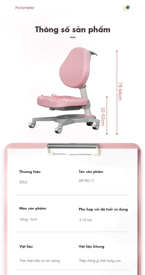 Ghế chống gù DRY-801-2 là mẫu ghế chống gù lưng dành cho trẻ em từ 3 – 18 tuổi. Ghế có thể thay đổi chiều cao phần đệm ngồi và tựa lưng một cách độc lập giúp bé có được tư thế ngồi thoải mái, chống gù lưng và cận thị.