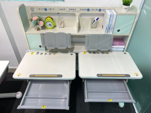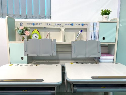 - Phụ kiện:Kệ sách, 02 ngăn bàn, 02 giá đặt sách/ipad, 02 hộc đựng đồ, 02 chặn sách, móc treo cặp, đồng hồ hiển thị độ nghiêng, chân bàn có bánh xe di chuyển, chế độ mở cánh tủ bằng nút ấn thông minh